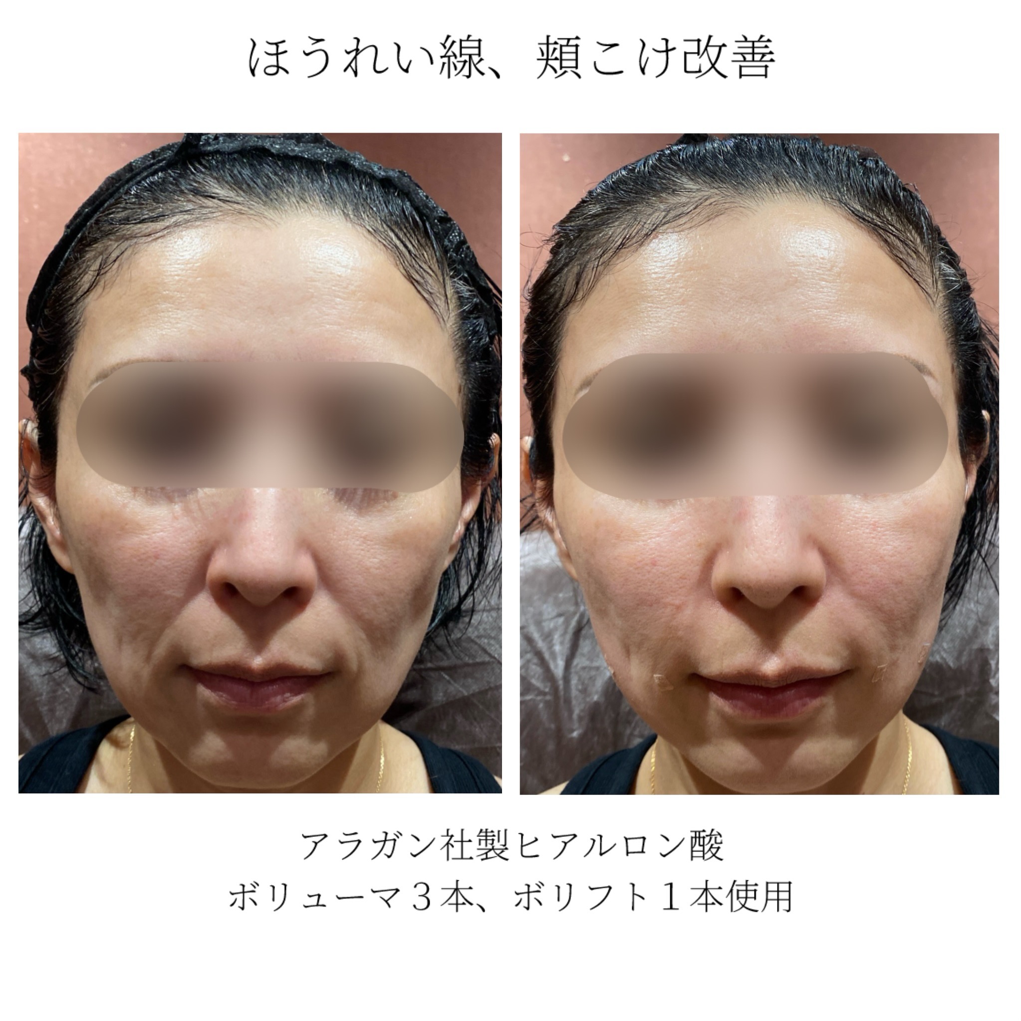 ほうれい線、こめかみのくぼみ、ほほのコケ、顎のライン、といったボリューム減少の改善や輪郭形成に使用します。
