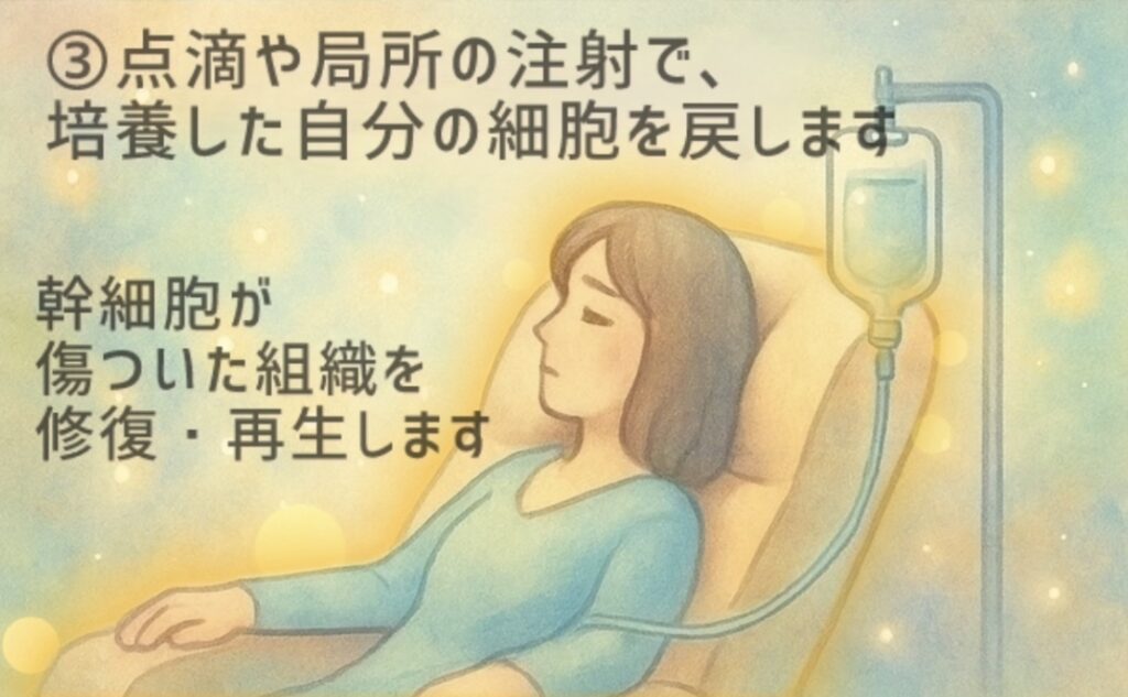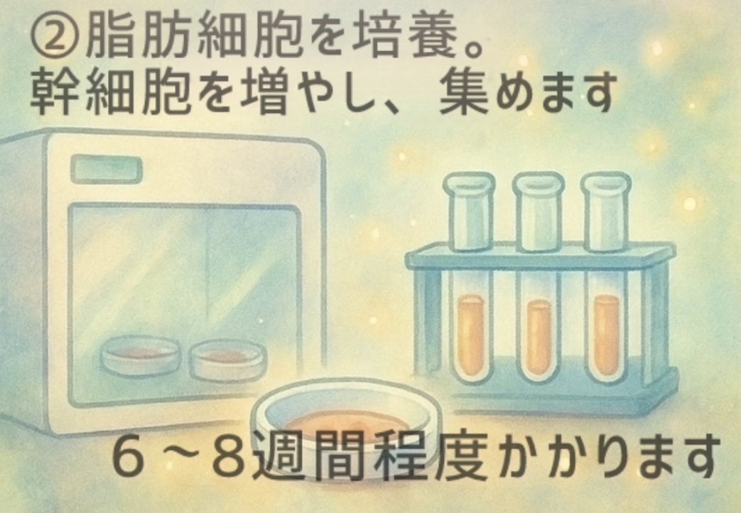 患者様ご自身の脂肪組織から採取した間葉系幹細胞を培養した上で、規定量まで増殖させてから元の身体に戻します。