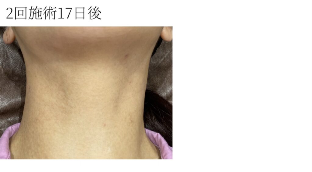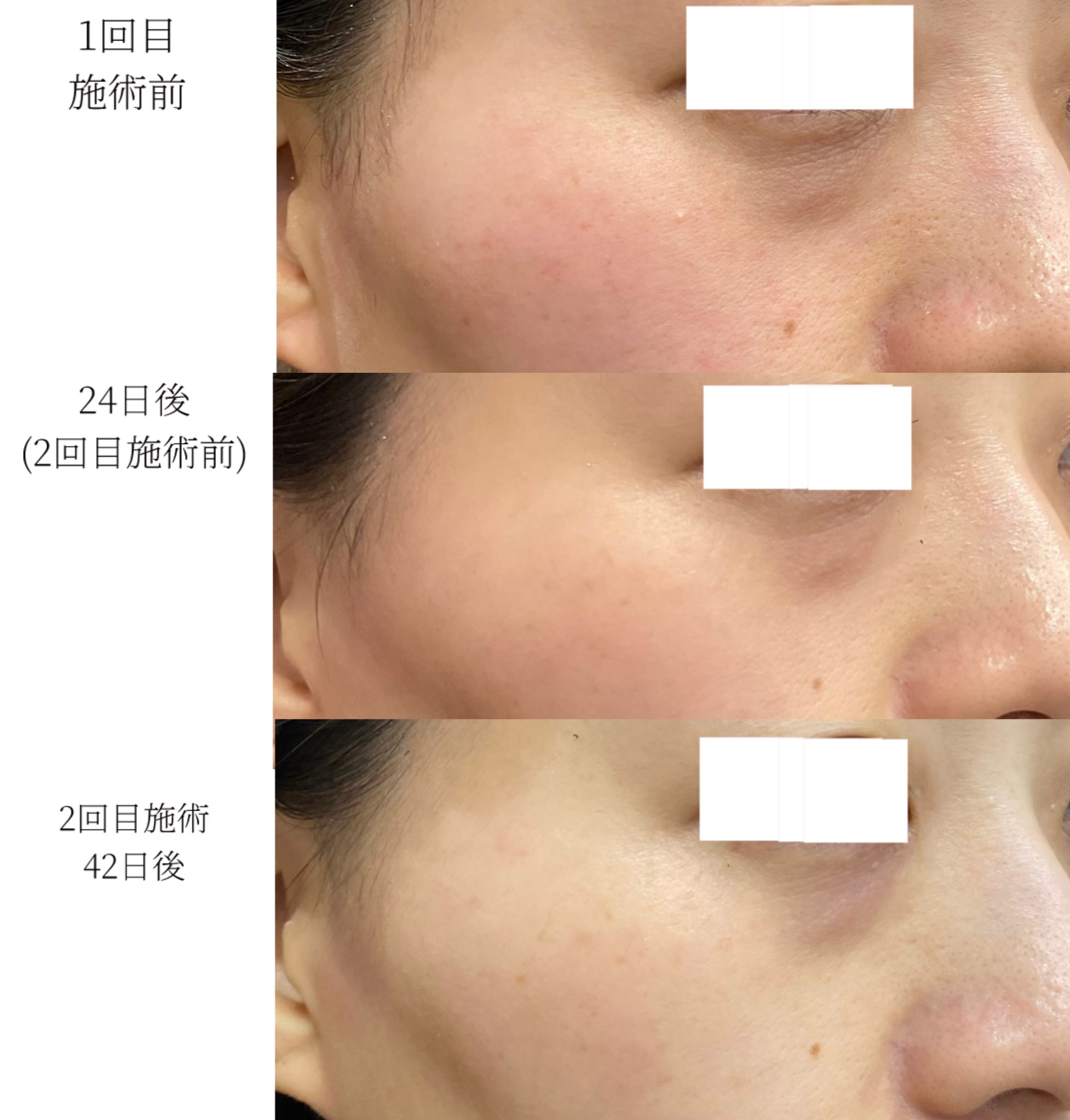 かゆみ、肌バリアの改善があり、施術約2週間後には海外旅行でたくさん日光を浴びたエピソードもありましたが(日焼け止めは使用されました)、色素沈着も軽くなりました。