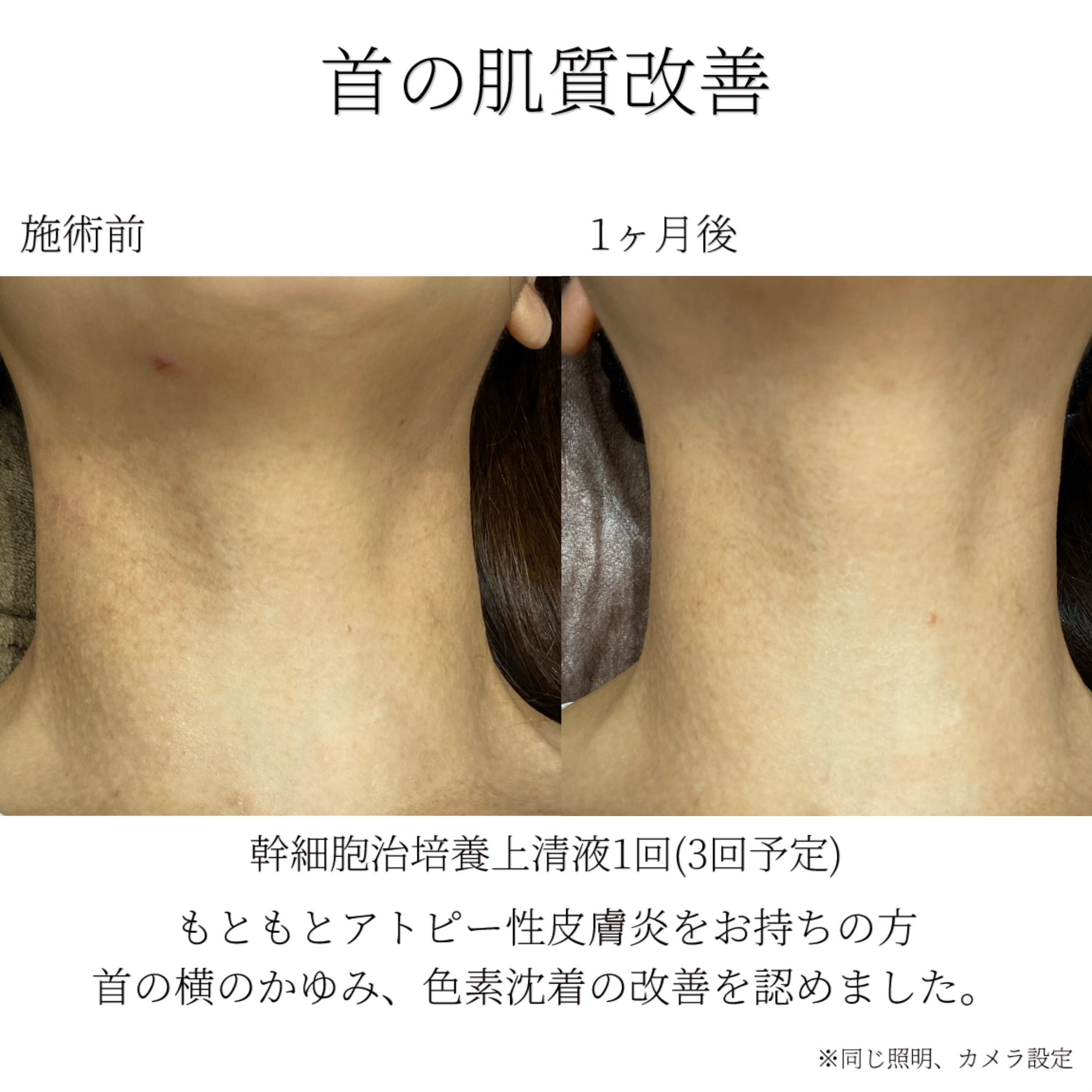 アトピー性皮膚炎の治療は一通りされた30代女性。首のかゆみ、色素沈着、肌質改善に幹細胞培養上清液施術を行いました。